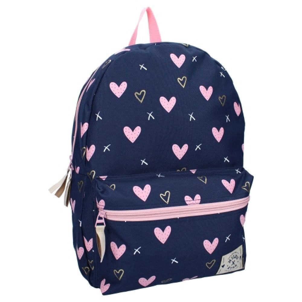 Zaino formato americano base blu con cuori rosa confetto.